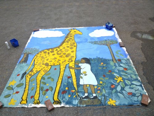 The Life Size project is under way. About 100 children from Drayton Park School and myself painted a three metre tall giraffe in one school day. It was tight and I wish there had been more time, but it went smoothly. Life Size is all about showing children size and scale in real terms. We talked about African animals, ways of measuring, what giraffes are like in the wild and they seemed genuinely interested. I got a great big box of chocolates and a thank you card from just about everyone so it was well worth it. The next workshops are at the end of July throughout Brent Council Libraries. I’ll try to remember to give a better heads up to those interested in coming along if you’re in London.