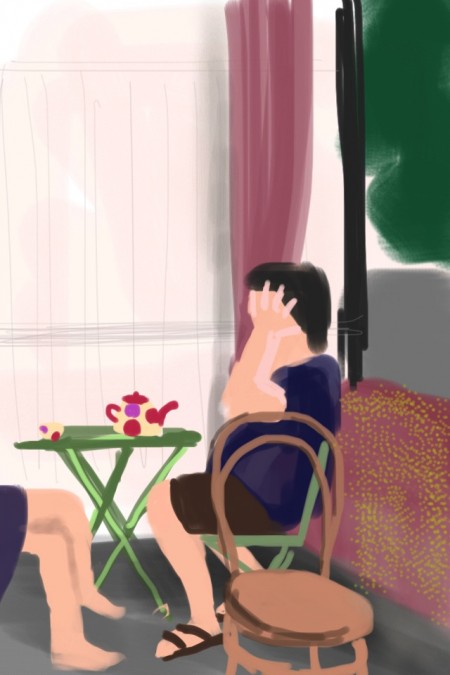 I went for a bicycle ride with my six-year-old daughter on Parkland Walk, a trail that used to be a train track. She’s new to riding and this was the longest journey she had made. At the end of the track, as it were, we found a cafe and I promised her a treat for being so brave. While we drank and ate I watched the only other people in the place as they talked and talked. I couldn’t resist as they were so engrossed.
