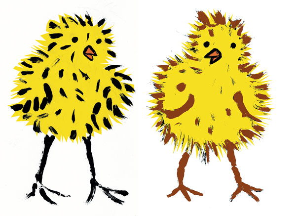 1. in Slovenia we use the word Kokoš for a grown up female chicken, Petelin for a grown up male chicken and Piščanec for small chickens like those two on the wonderful drawing 🙂 heh..