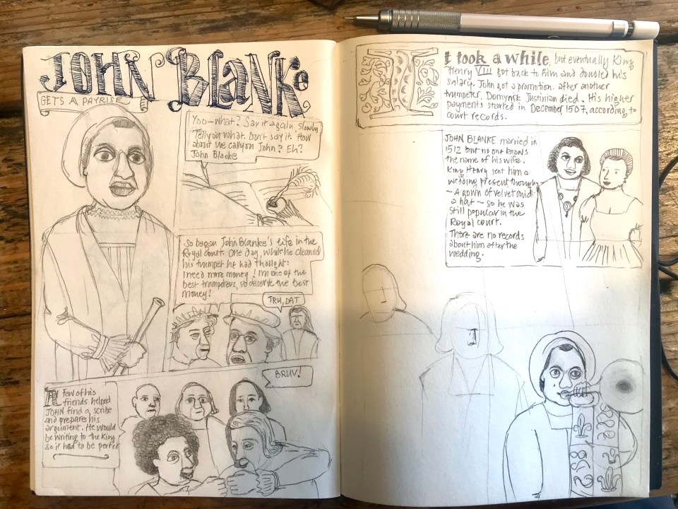 Then most exciting thing about making comic strips is actually the writing (for me, anyway) and with this story, there was a lot of leeway with the text. Not much is known about John Blanke, other than he served in the royal court as a trumpeter, he was liked by Henry VIII, and his claim to fame was that he successfully petitioned the king for a promotion and a pay rise. Oh yes, and he got married at some point.