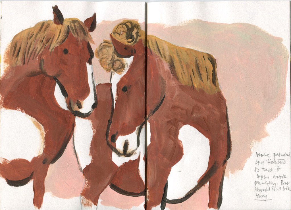 I used video and photographic reference. It wasn’t life drawing that was needed anyway, but an interpretation of horses seen through the imagination of a young boy. This led back to more questioins: Who is this boy? How would he draw horses?